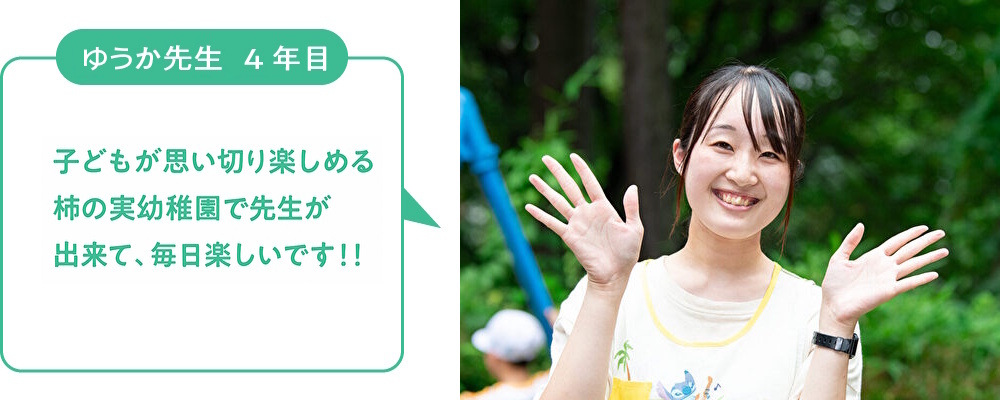 私は幼少期に柿の実幼稚園に通っていました。子どもの頃に幼稚園で経験した様々な楽しい行事を、私も保育者としてたくさんの子どもたちに経験させてあげたい!そして憧れの担任の先生のように、笑顔が素敵でかわいくてキラキラした人になりたいと思い、保育士を目指し、柿の実幼稚園に入職しました。柿の実幼稚園は広い園庭と裏山もあって、毎日がピクニックと言われるくらい遊び場がたくさんあるところが魅力で、子どもたちの遊び方も無限大です。そんな伸び伸びとした環境があるのは柿の実幼稚園しかないと思ったので、他の園は全く考えず、学生時代も実習でお世話になり、柿の実の魅力を再確認してから就職をしました。